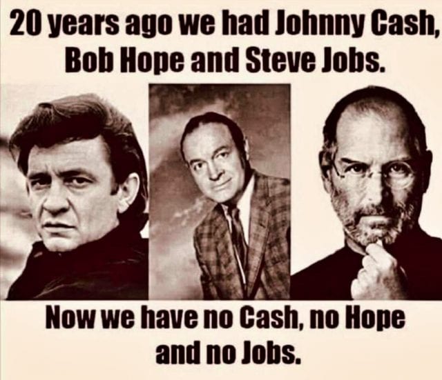 Ótima charge, a dos gênios. Também genial, quem a produziu. Resta dizer que felizmente ainda há Cash na cantora e compositora que Johnny deu ao mundo, sua filha Rosanne. Quem já a ouviu cantar September When It Comes em dueto com papai Johnny, sabe da alegria que a melhor música põe em nossas mentes e nossos corações.