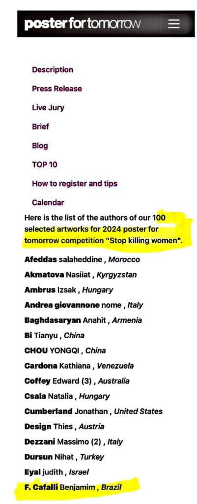 Um concurso internacional na França, “Posters for Tomorrow/‘Stop Killing Women’”, recebeu quase 7 mil inscrições. Benjamim foi um dos Top100 escolhidos: