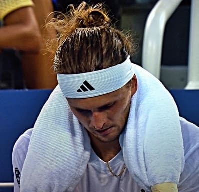 O tenista alemão Alexander Zverev, 1,97 m, derrotado pelo espanhol Carlos Alcaraz em uma das semifinais, parecia à beira de um enfarte durante a partida.