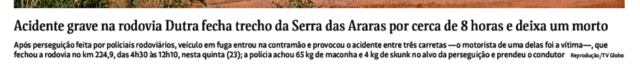 Na sexta, o “Mira” publicou nota a respeito de um erro de informação ocorrido na quinta (23) – Acidente na Dutra, batida entre carros, congestionamento, engavetamento de três carretas, morte de um dos motoristas. Não houve relação entre a trombada e o engavetamento. O g1, primeiro a noticiar o acidente, corrigiu-se. O UOL publicou matéria do site da “Folha de S.Paulo” com o erro e não houve correção. Então, veio o pior. Na sexta, a “Folha” impressa repetiu a informação errada: