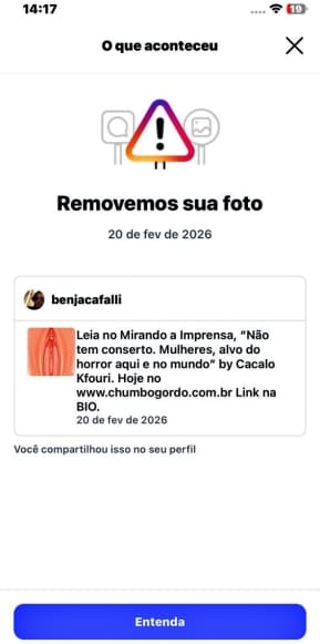 O Instagram censurou e removeu a postagem do Benjamim com a ilustração do Mirando de sexta-feira (20).